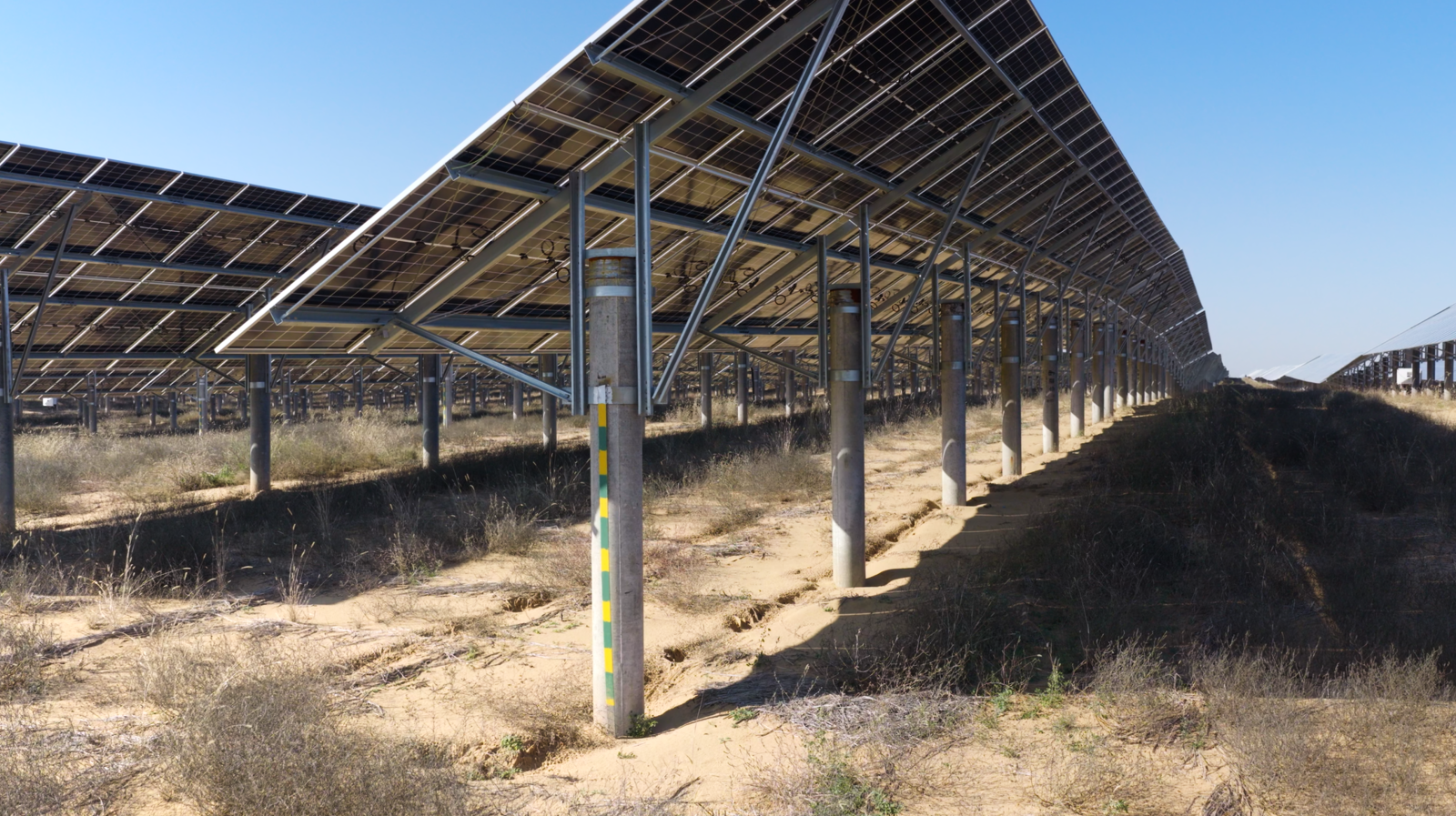 •项目需求:项目选址于典型的沙地环境,客户的核心需求是建设一座能够长期抵御风沙侵蚀、确保在恶劣气候下稳定运行,并同步实现生态修复功能的大型光伏电站。具体而言,支架解决方案必须:1)具备极强的抗风沙与结构耐久性,以应对频繁的风沙活动;2)通过科学的阵列设计,为板下植被恢复创造有利条件,助力“板上发电、板下修复”;3)适应沙地地形,确保大规模施工的可行性、经济性与可靠性。