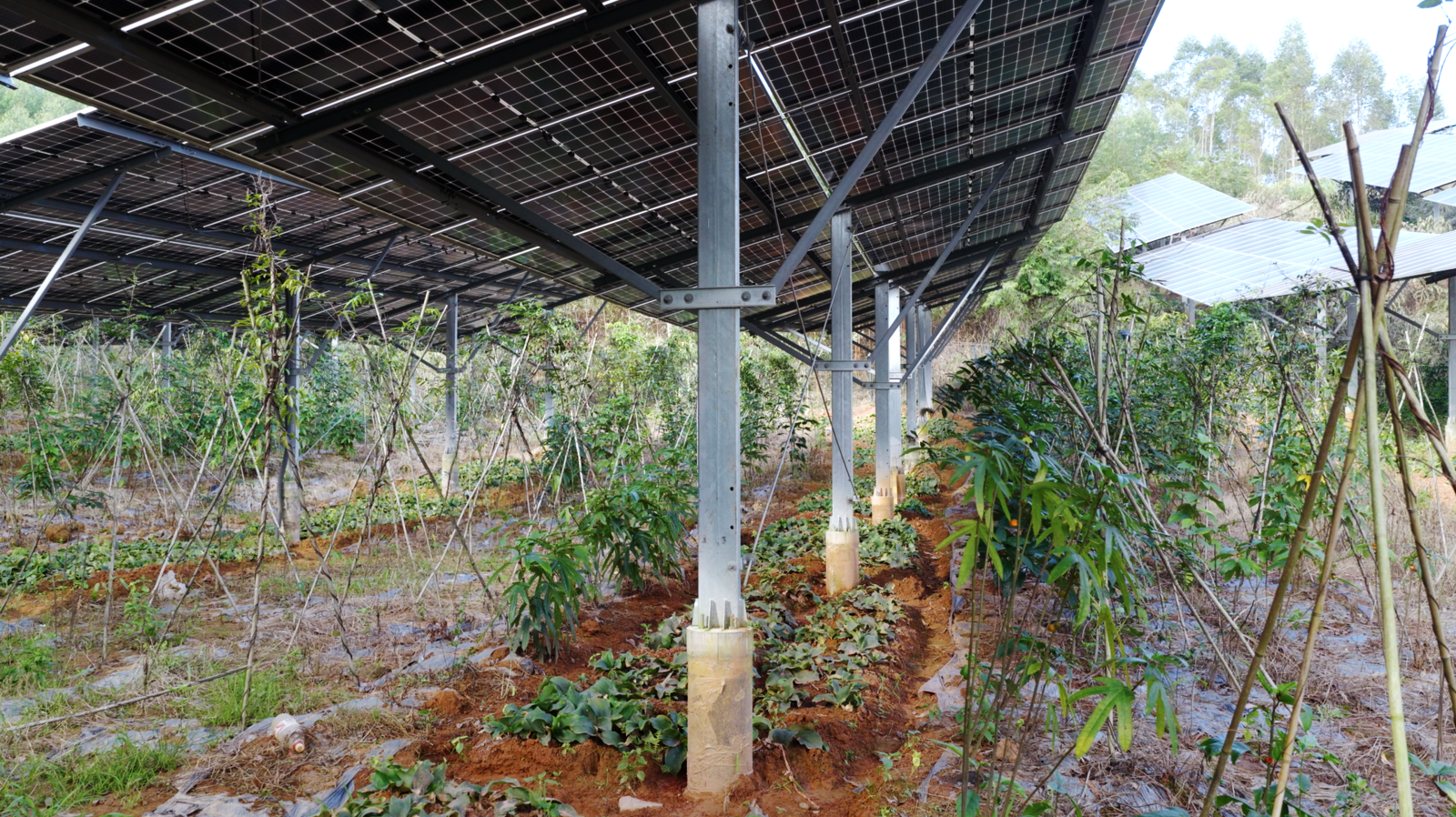 •项目需求:项目选址于典型的南方山区,面临湿热多雨、地形复杂等自然条件。客户的核心需求是获得一套能够长期稳定运行于湿热环境、兼顾光伏发电效率与农业种植空间的固定支架解决方案。具体要求包括:(1)支架系统必须具备优异的耐腐蚀性能与结构可靠性,以应对高温高湿气候;(2)设计需为板下农业活动预留充足空间,实现土地资源的高效复合利用;(3)基础方案必须适应复杂地质,确保整体稳固安全。