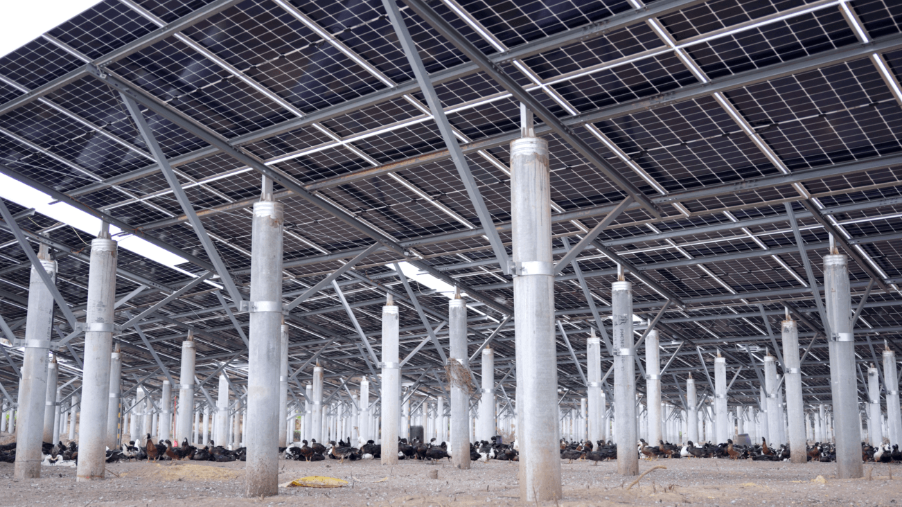 •项目成功建成,实现发电养殖双赢:80MW光伏电站已在茂名顺利并网运行。安泰新能源提供的固定支架系统,以科学的离地高度、稳固的结构设计,成功实现了“板上发电、板下养殖”的立体化产业布局,为肉鸭养殖创造了优越的生态环境。